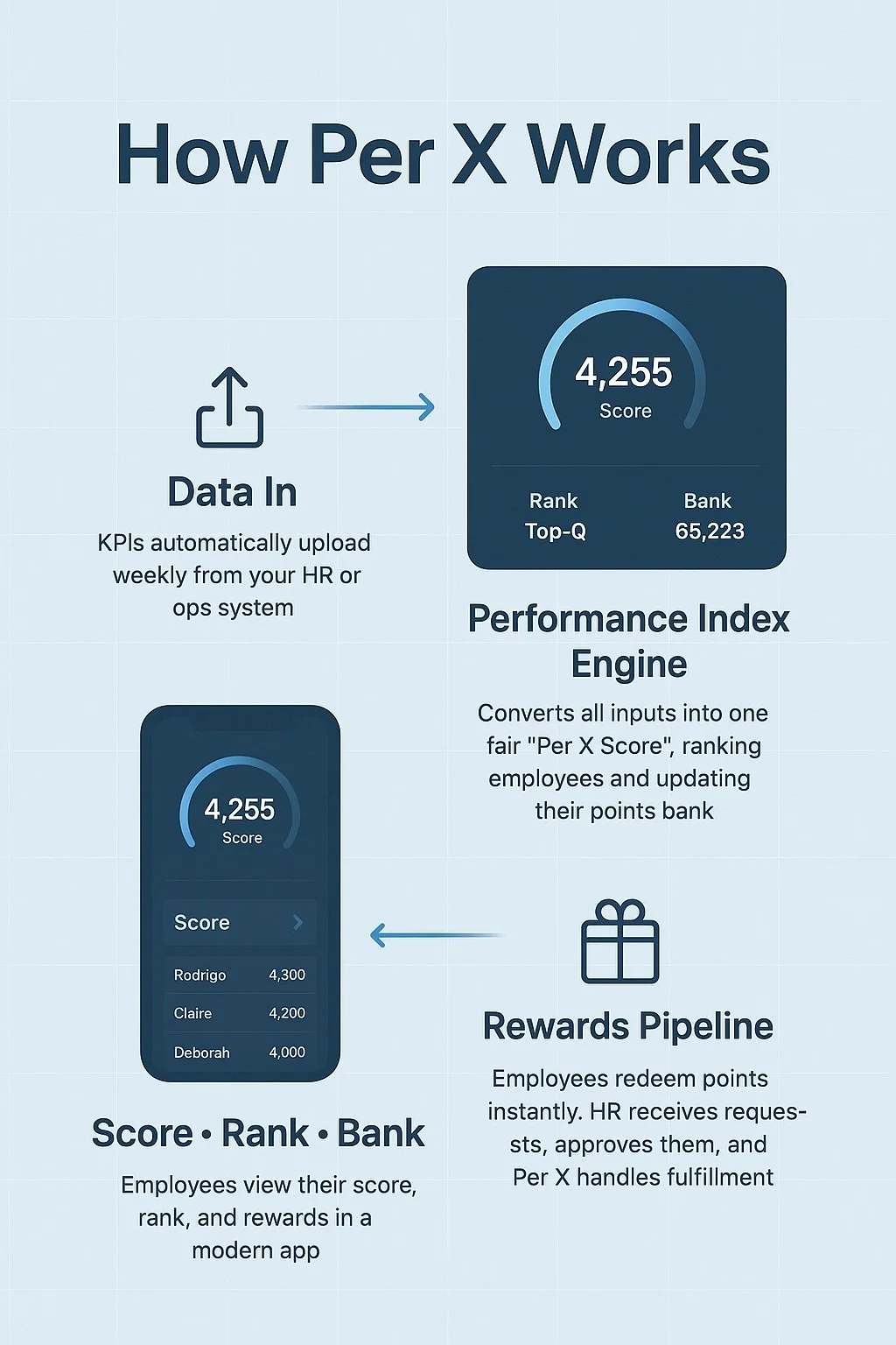 Per X fills the gap. Our Performance Index unifies employee attendance, quality, productivity, and behavior into one transparent score. We then tie it directly to rewards your team can see, chase, and earn.
